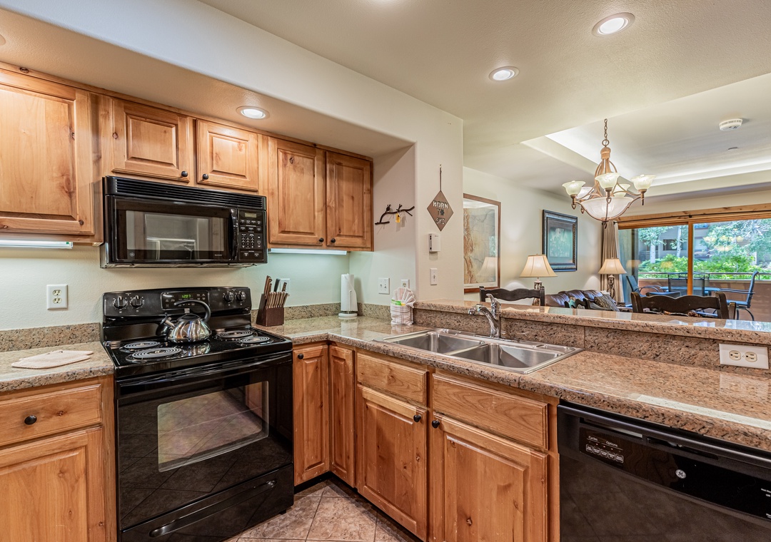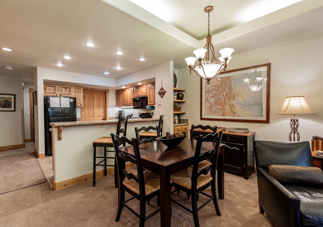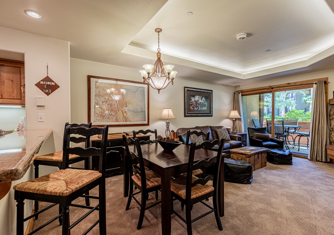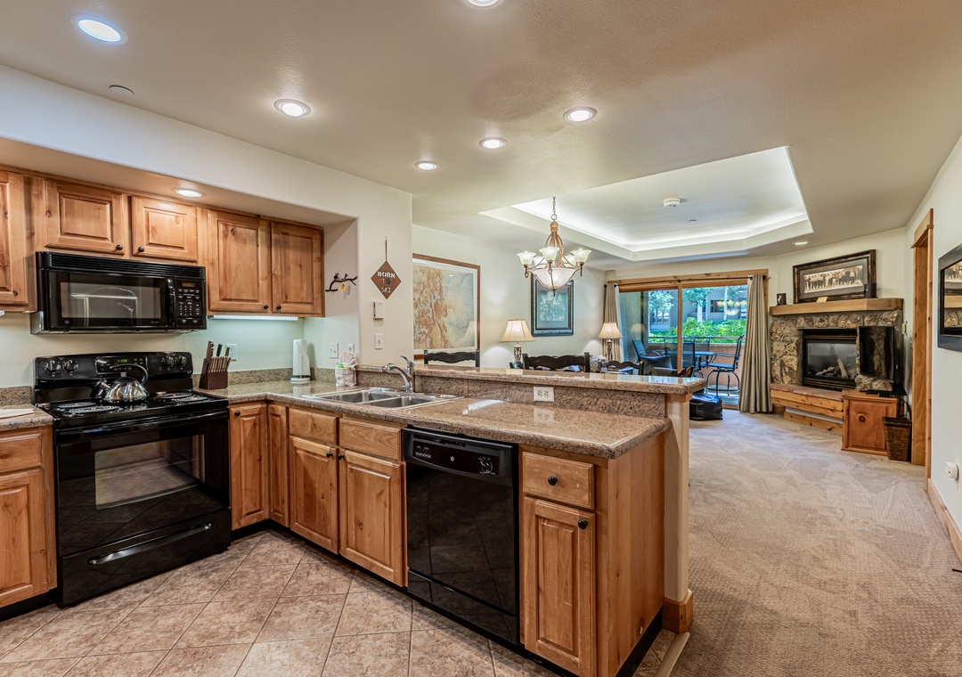 After a day on the slopes or trails, come home to a cozy living area complete with a gas fireplace, Smart TV, and access to your private balcony, where you can spot the top of the gondola and Thunderhead Lodge in the distance. The fully equipped kitchen makes it easy to dine in, and the open layout is perfect for relaxing with friends or family.