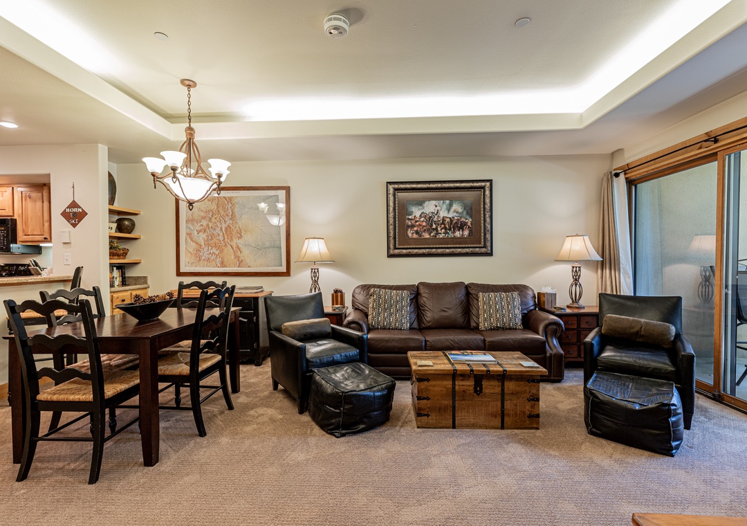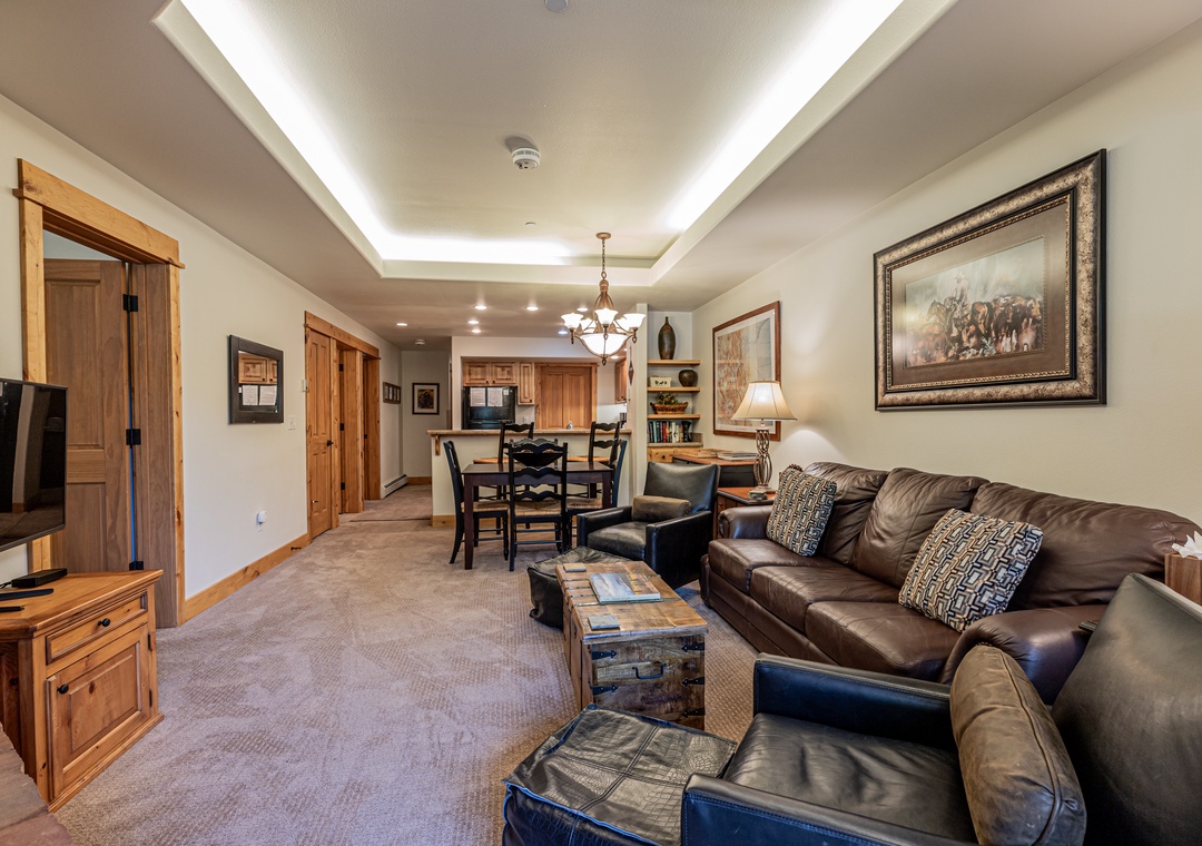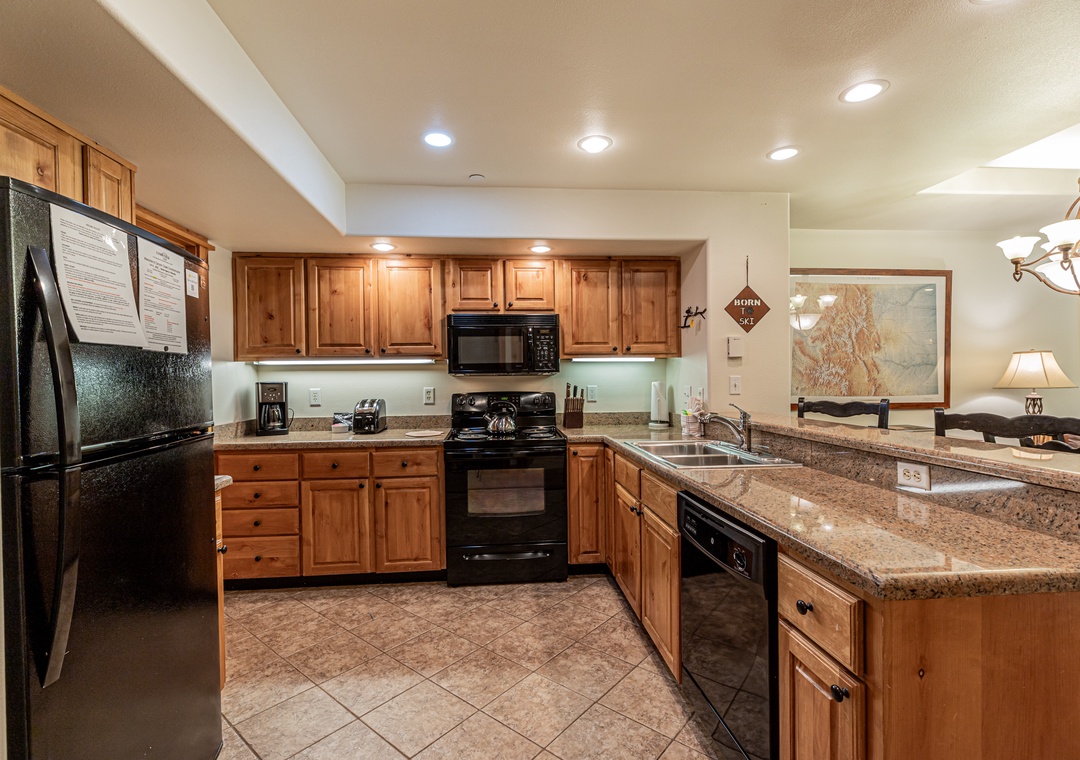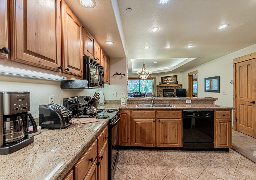 After a day on the slopes or trails, come home to a cozy living area complete with a gas fireplace, Smart TV, and access to your private balcony, where you can spot the top of the gondola and Thunderhead Lodge in the distance. The fully equipped kitchen makes it easy to dine in, and the open layout is perfect for relaxing with friends or family.