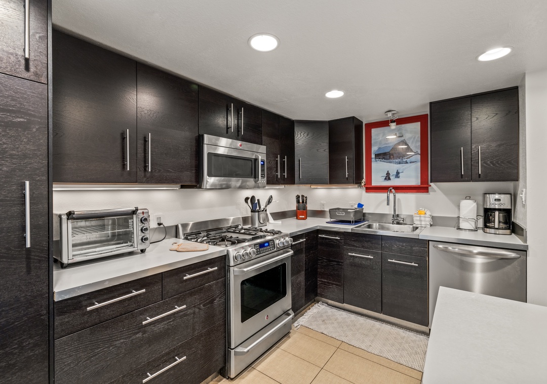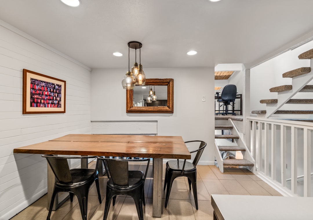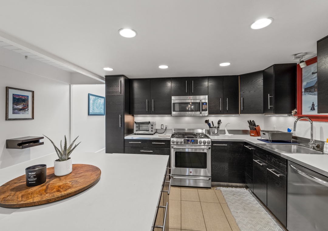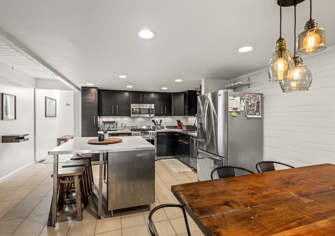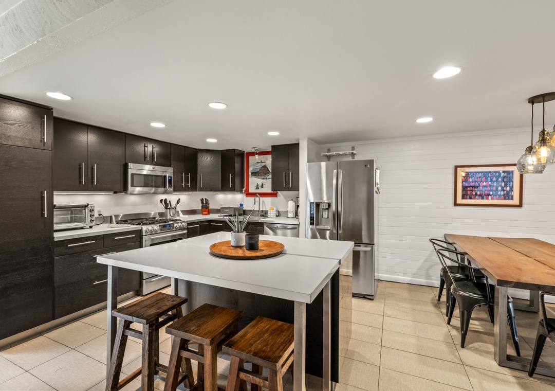 • The fully stocked kitchen has a kitchen island for food prep and with 3 stools and a dining table seating 5