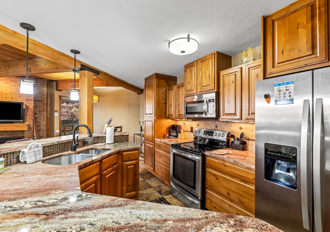 • The kitchen features granite countertops, stainless appliances, and ample space for food preparation