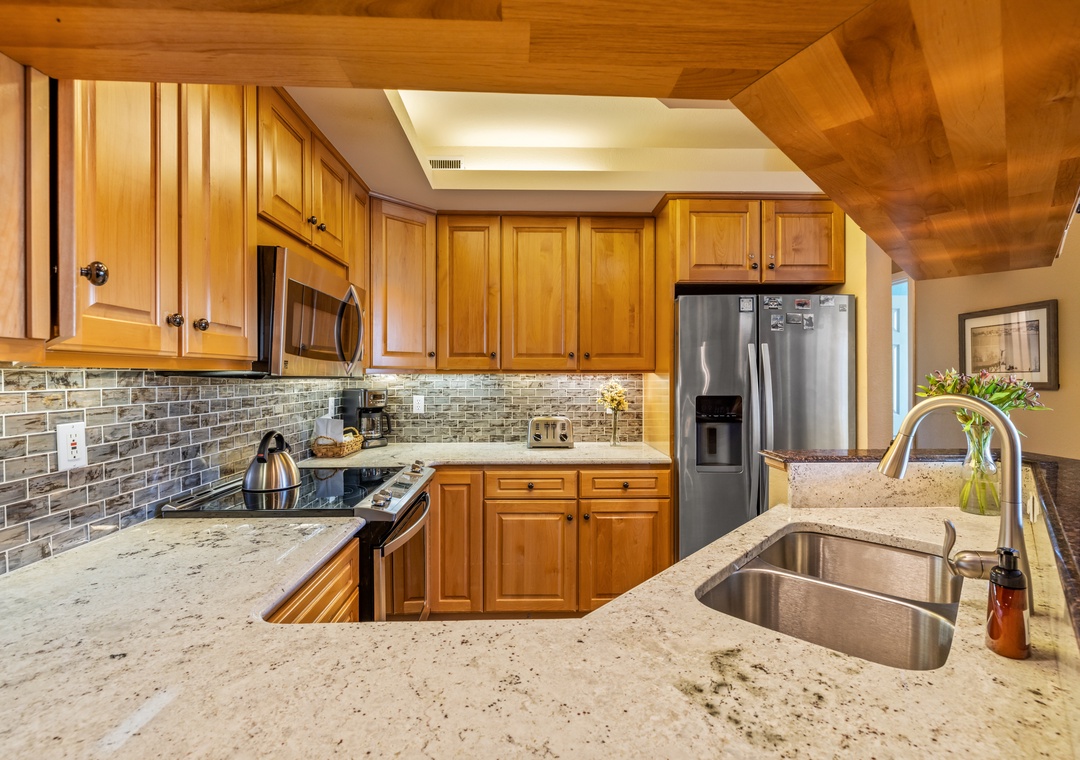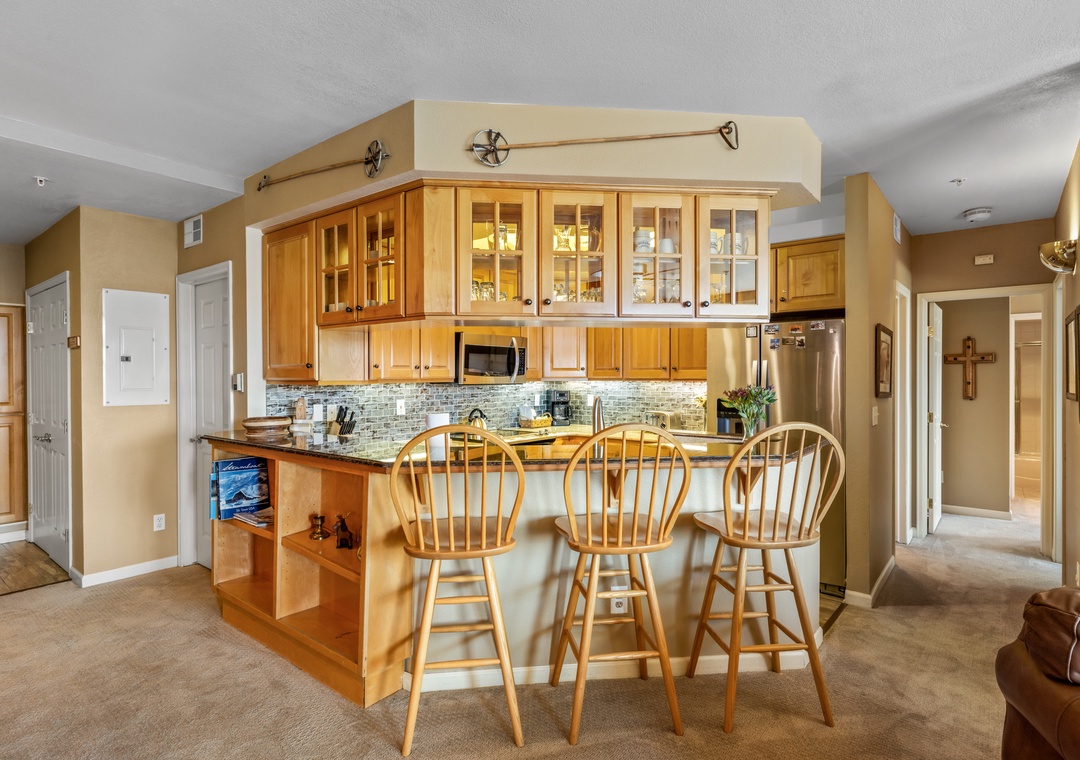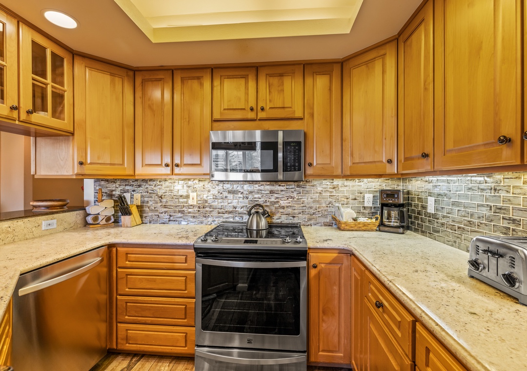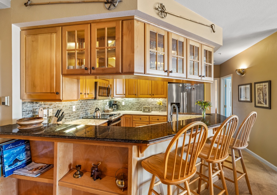 • Make use of the fully stocked kitchen featuring stainless appliances, stone countertops, and space for 3 at the breakfast bar
