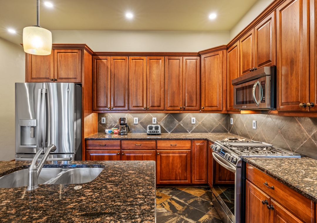 • Fully Stocked Kitchen – Granite countertops, stainless-steel appliances, ample prep space, and breakfast bar seating for four