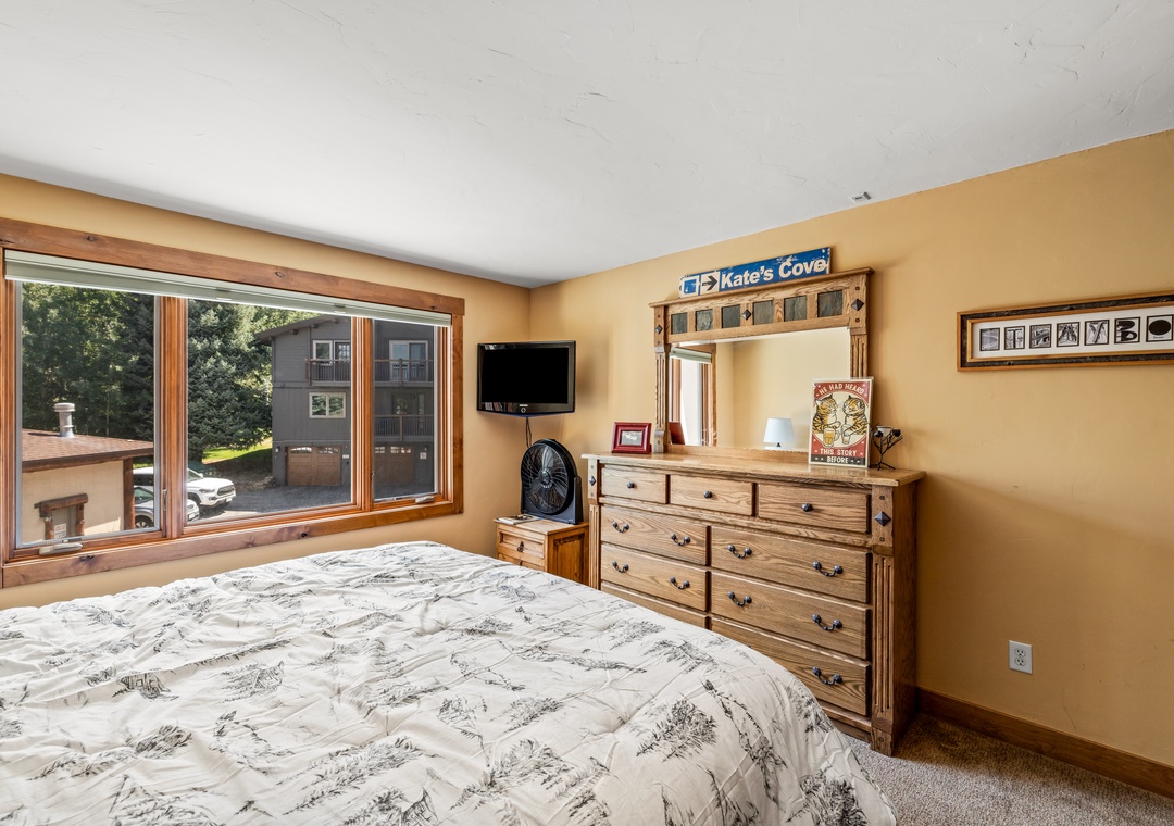 Primary Bedroom: King bed, ensuite with tub + walk-in shower, flat-screen TV, large window with blackout shades.