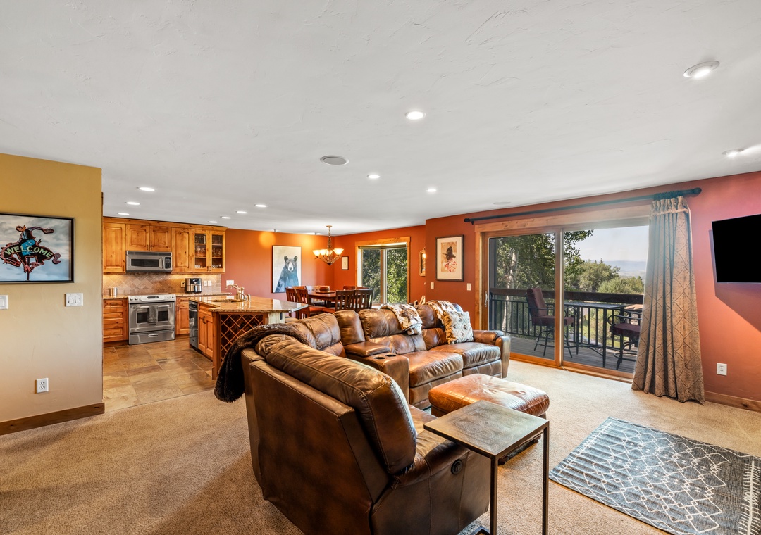• Spacious Living Area: Open-concept layout with large windows, leather sectional sofa, gas fireplace, and flat-screen TV.