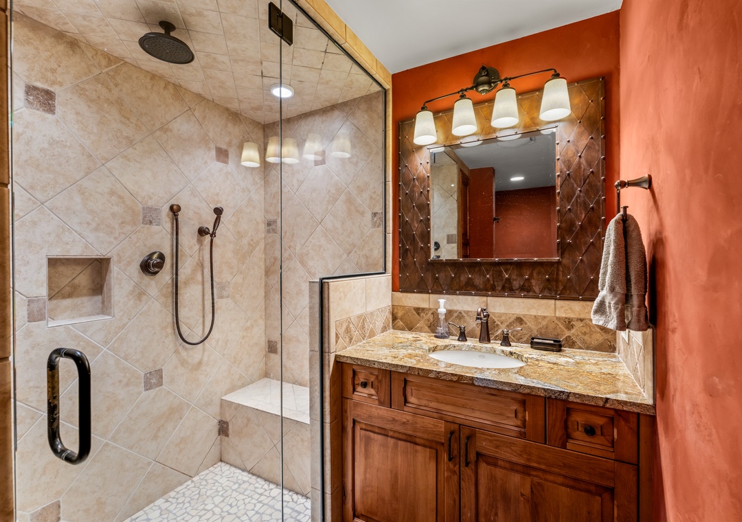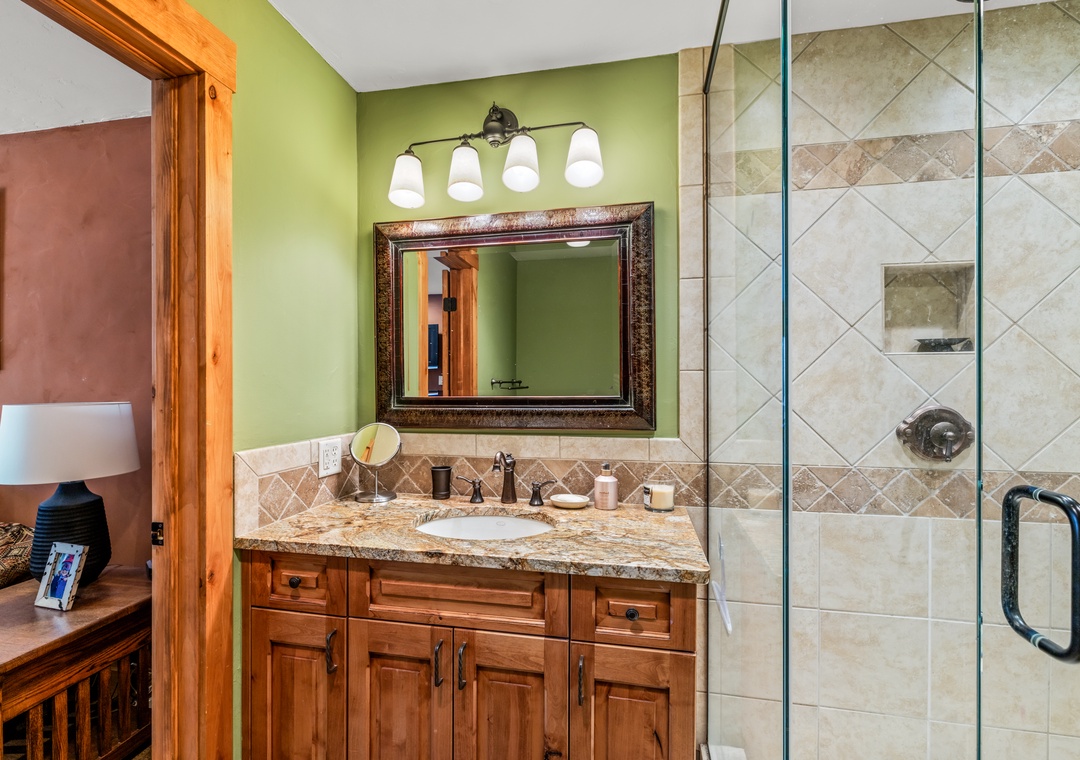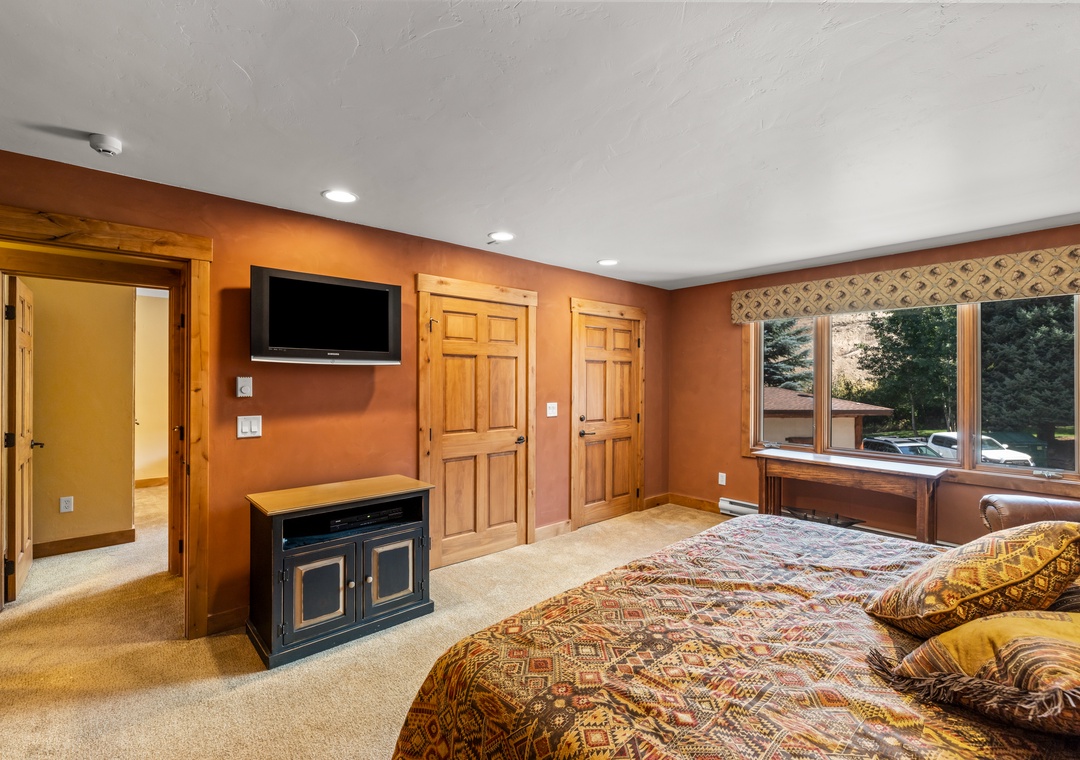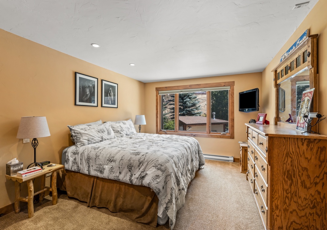 Second Bedroom: King bed, flat-screen TV, blackout shades, shared full bath with spacious steam shower.