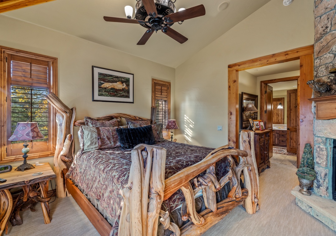 Main-floor primary bedroom with a fireplace and a luxurious ensuite bathroom, including a jetted soaking tub, walk-in shower, and dual vanities