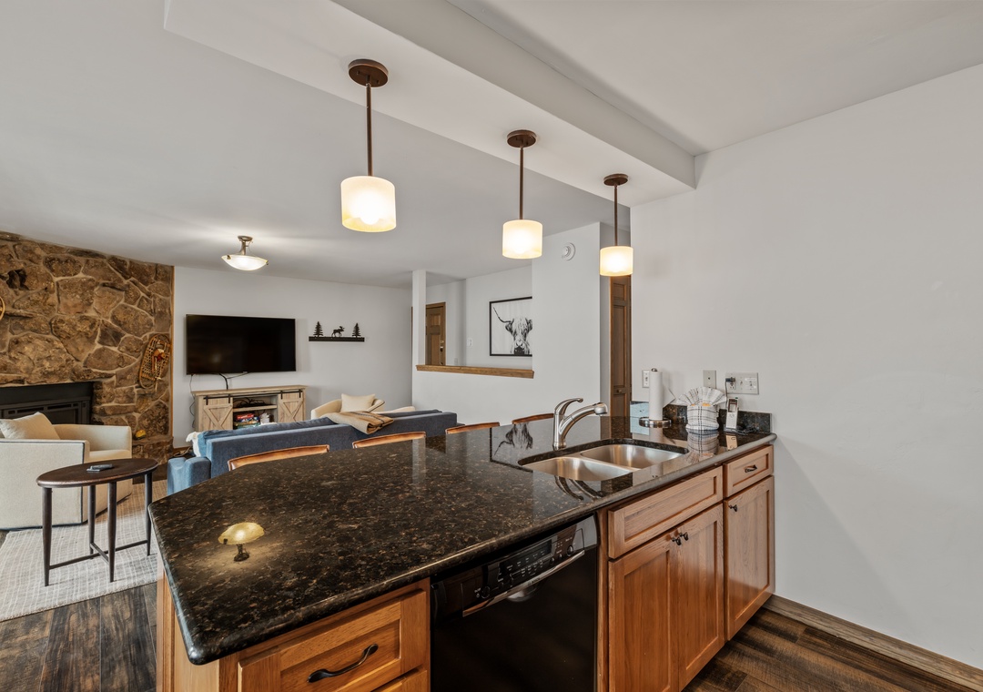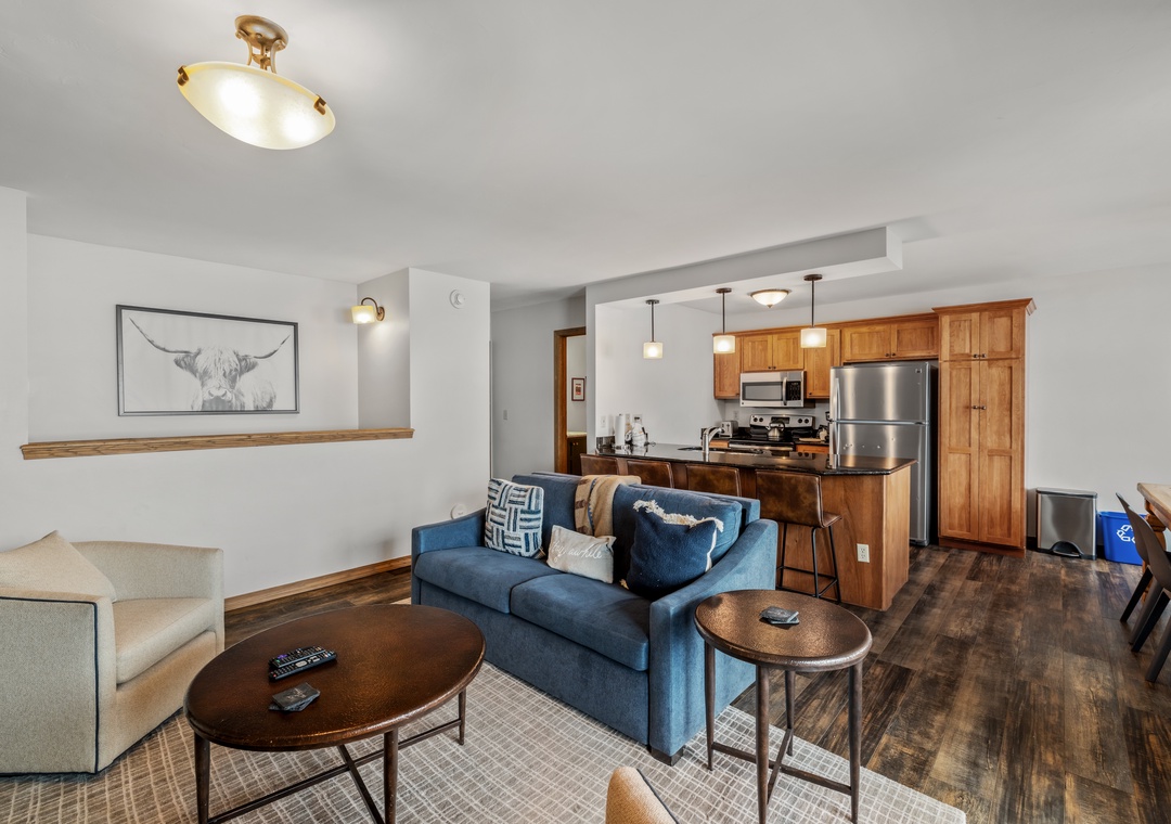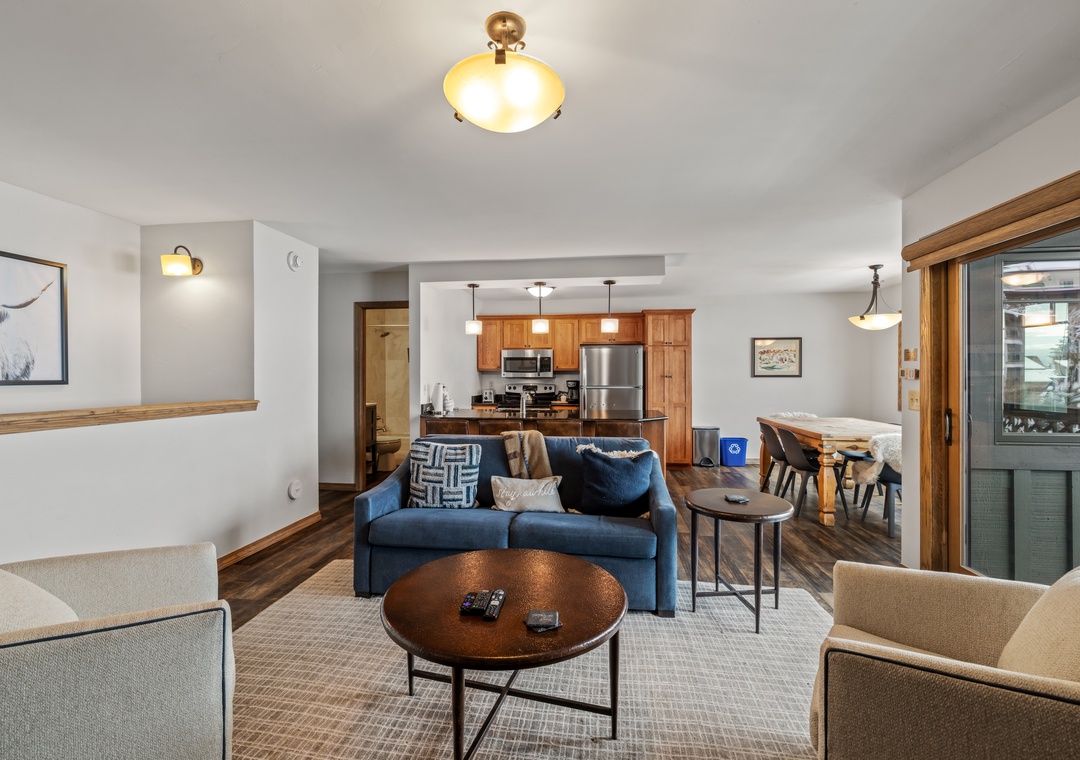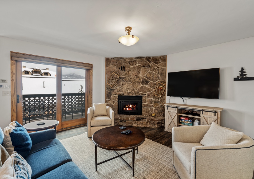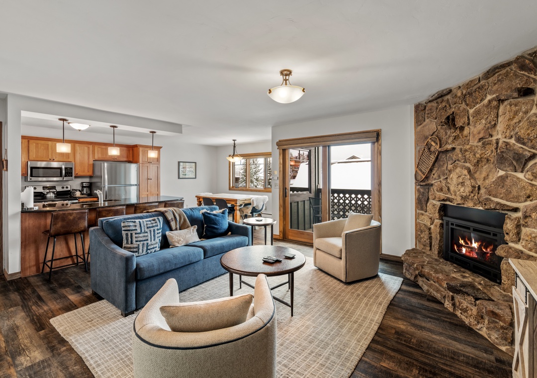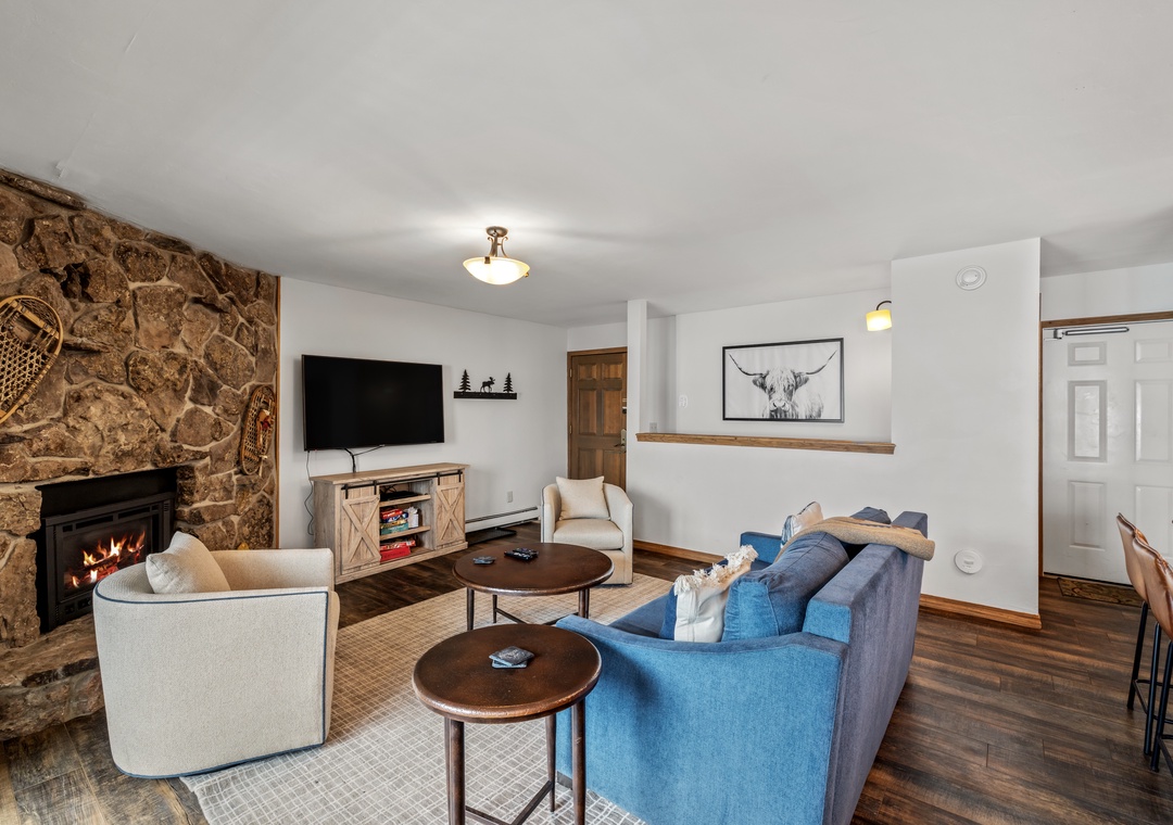 - Comfortable Gathering Space: Open-concept living/dining/kitchen with gas fireplace* and Smart TV