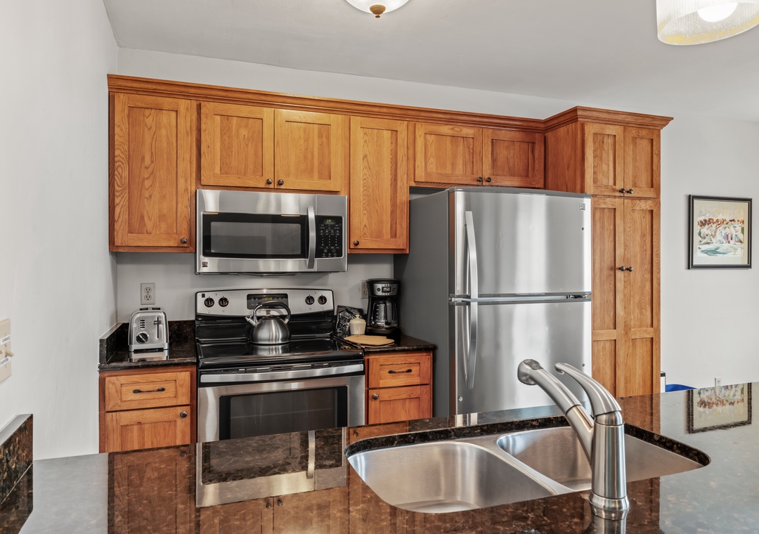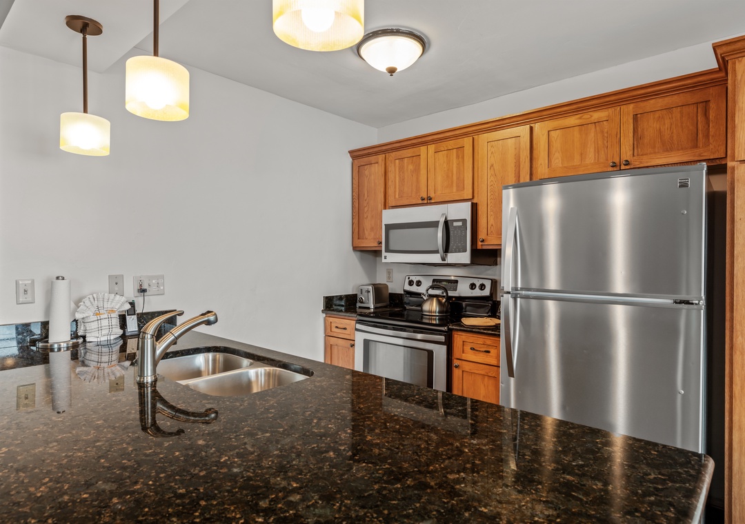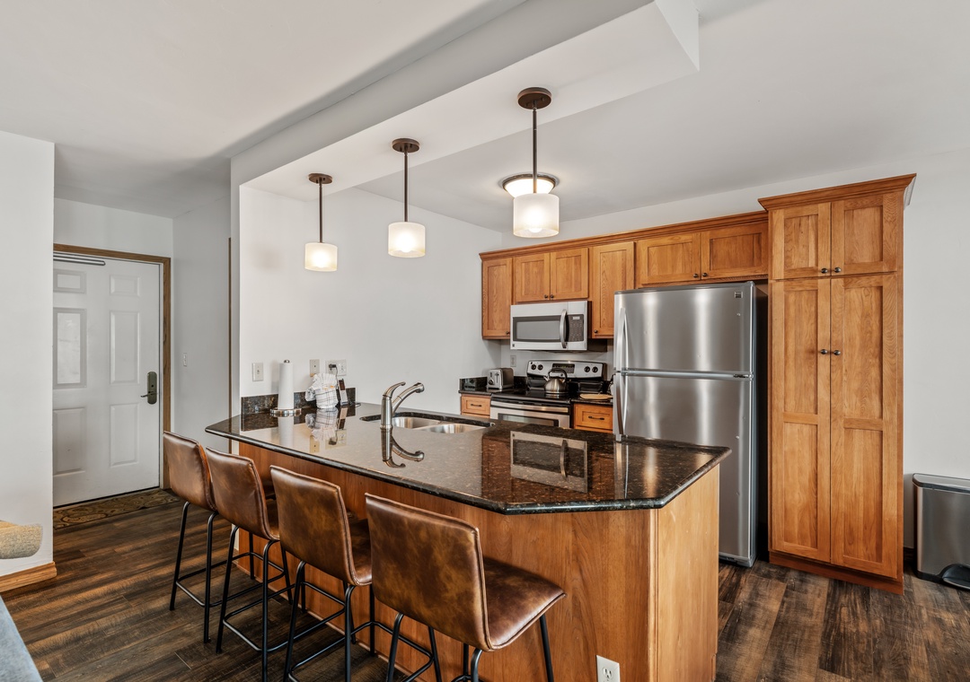 - Fully Equipped Kitchen: Stainless steel appliances, granite countertops, and island seating for 4