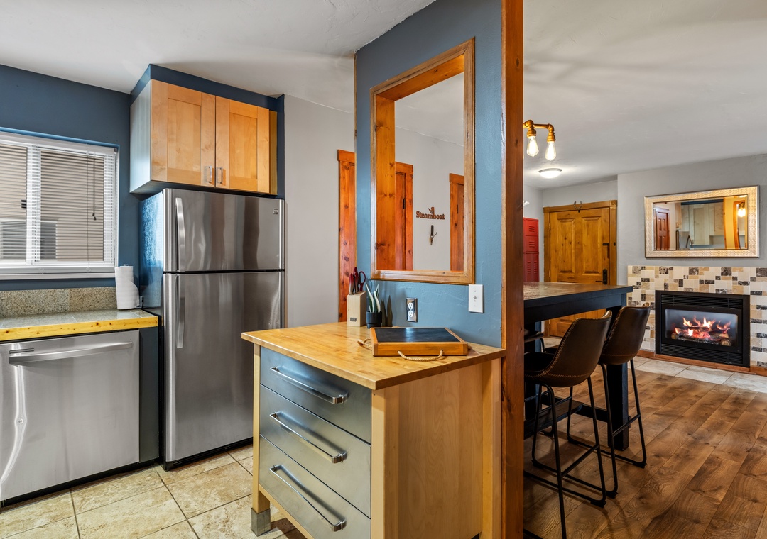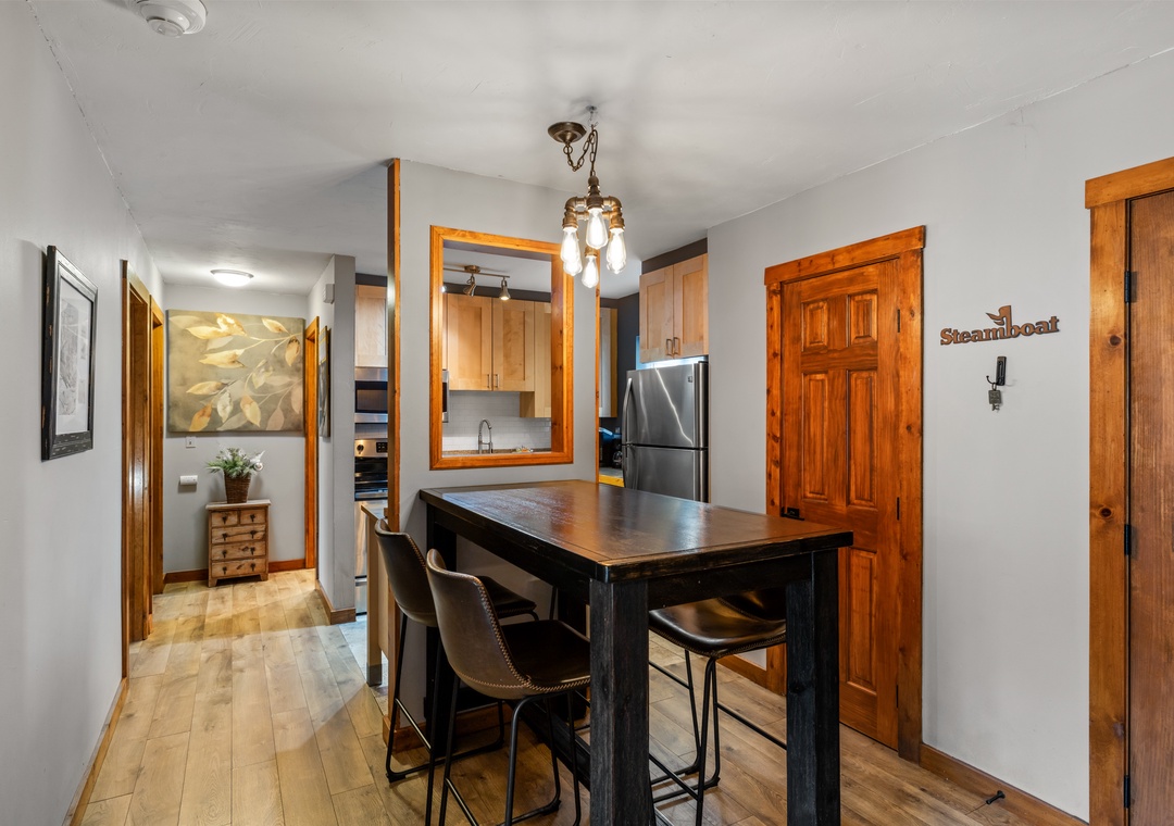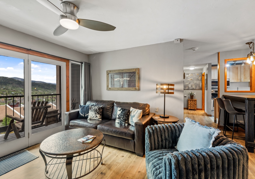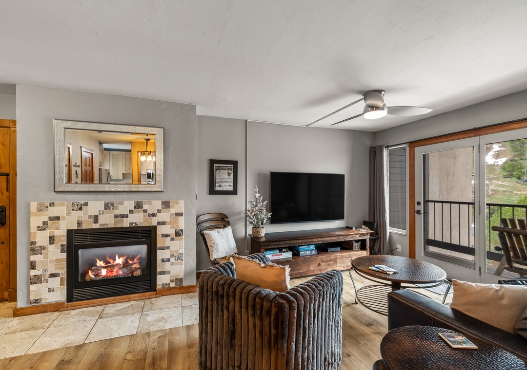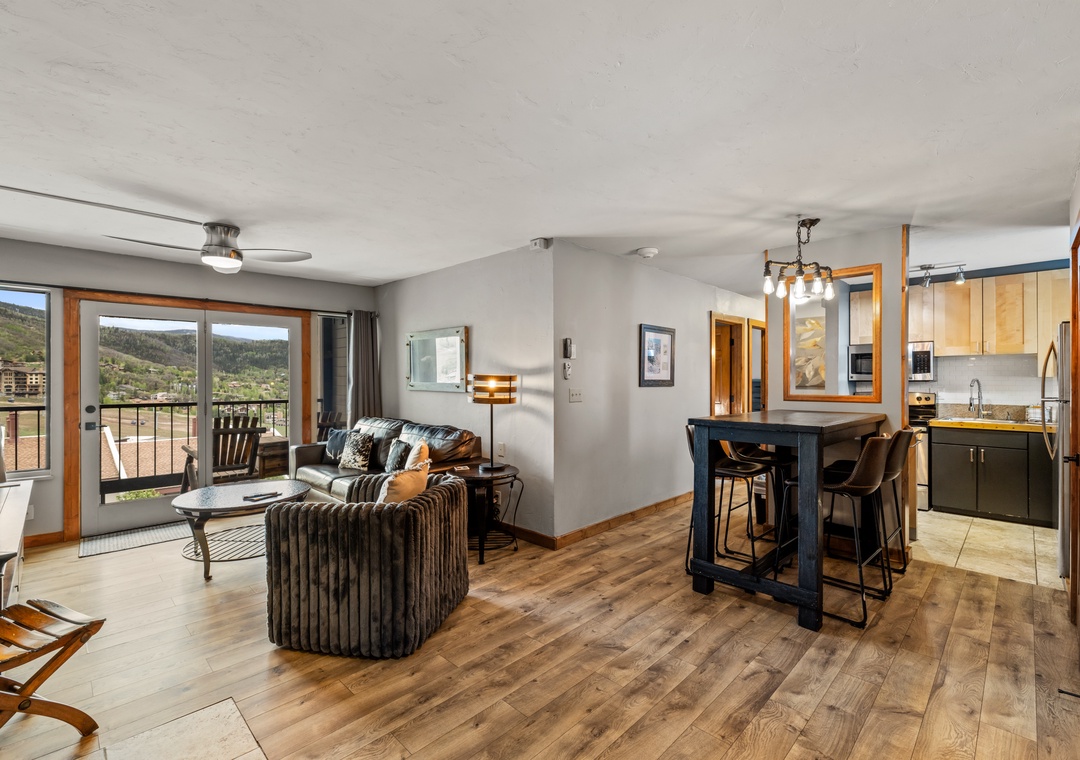 Relax in a stylish mountain-modern space featuring a gas fireplace, large Smart TVs, and sweeping views of Mt. Werner and the surrounding Rockies. The fully updated kitchen with stainless steel appliances and dining space for four makes eating in easy and enjoyable.