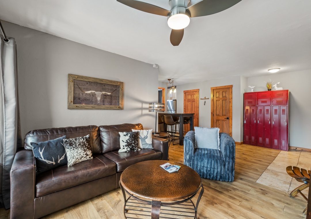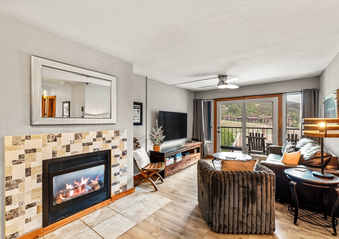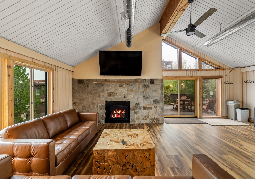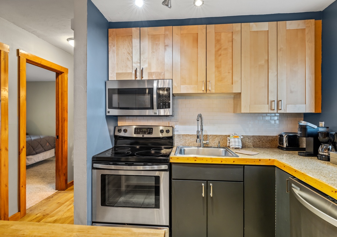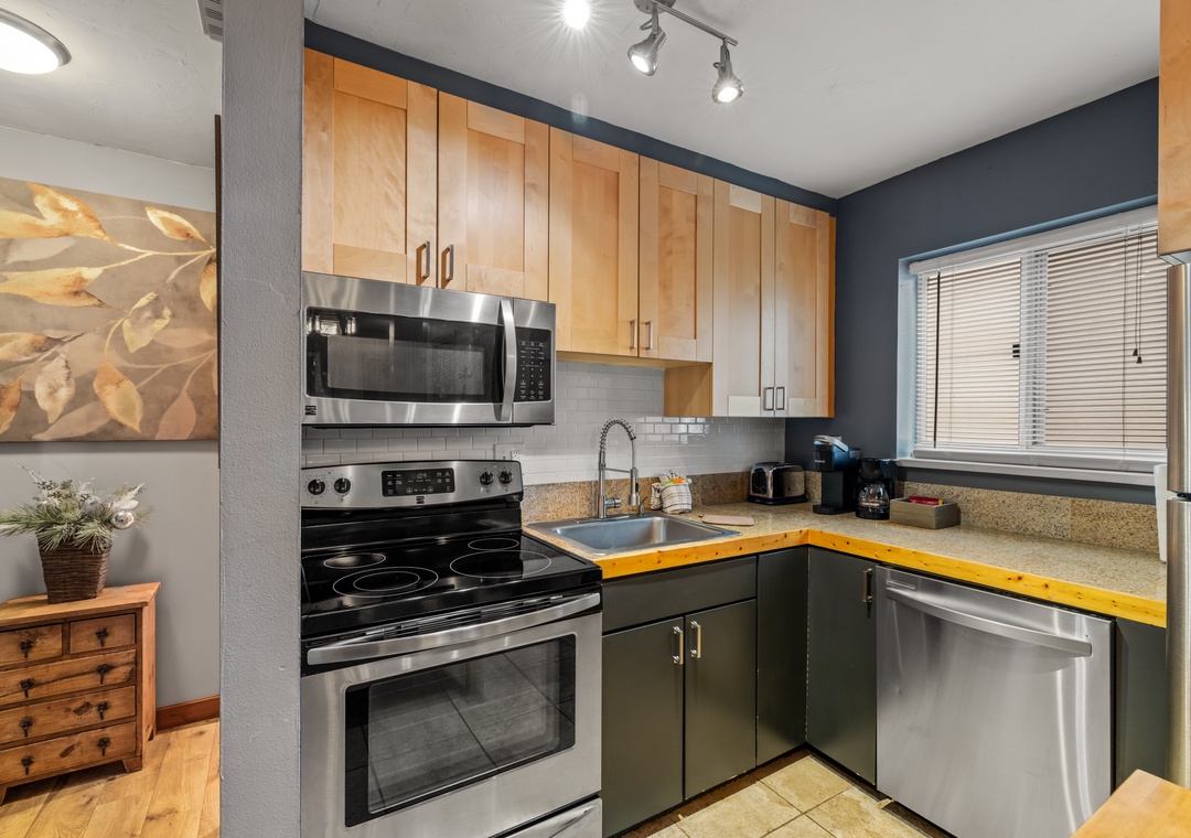 Relax in a stylish mountain-modern space featuring a gas fireplace, large Smart TVs, and sweeping views of Mt. Werner and the surrounding Rockies. The fully updated kitchen with stainless steel appliances and dining space for four makes eating in easy and enjoyable.