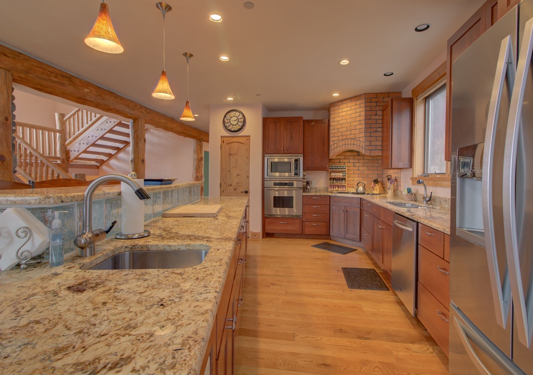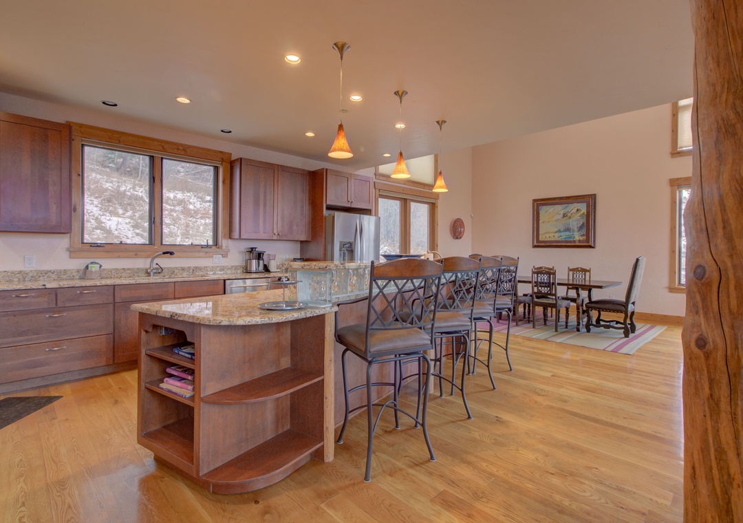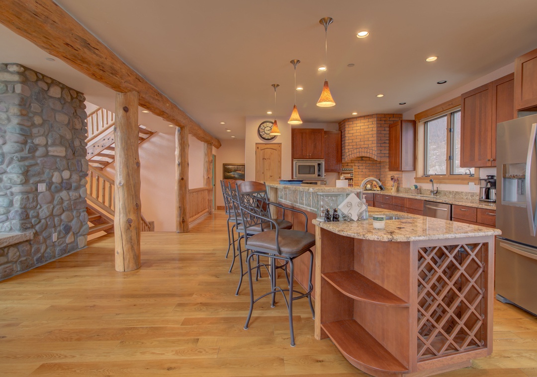 - Fully Equipped Chef’s Kitchen – Stainless steel appliances, ample counter space, and bar seating for 4