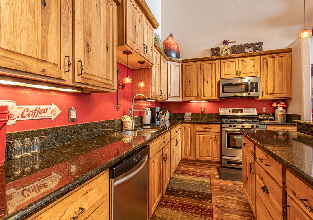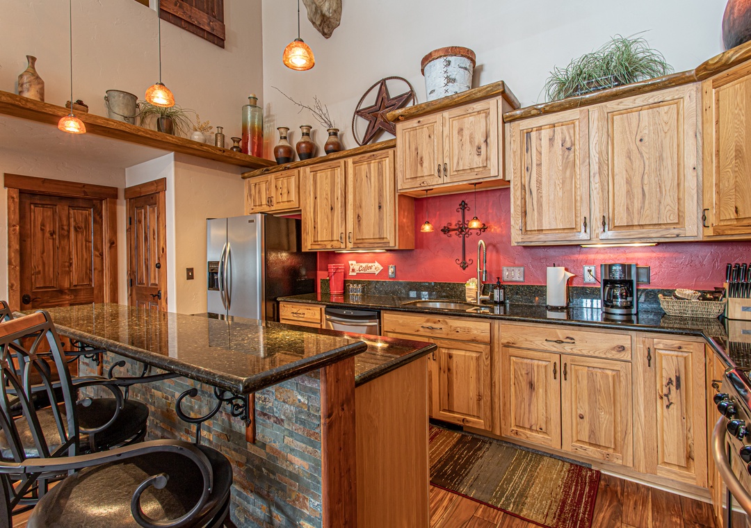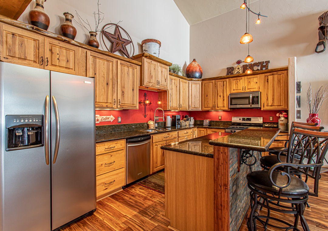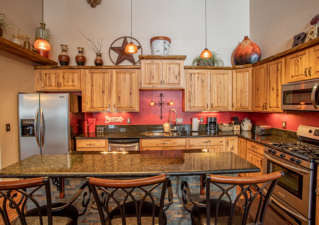 - Gourmet Kitchen – Stainless appliances, granite counters, and bar seating for 3