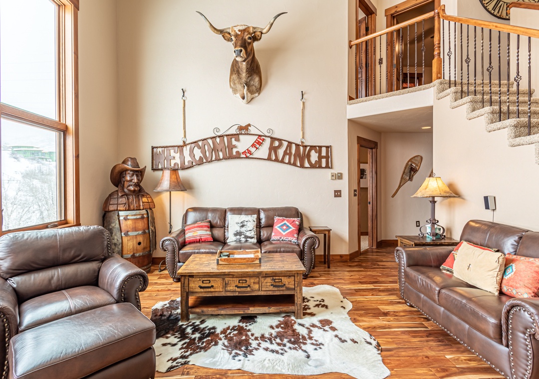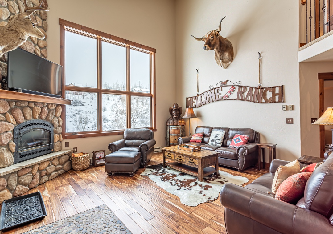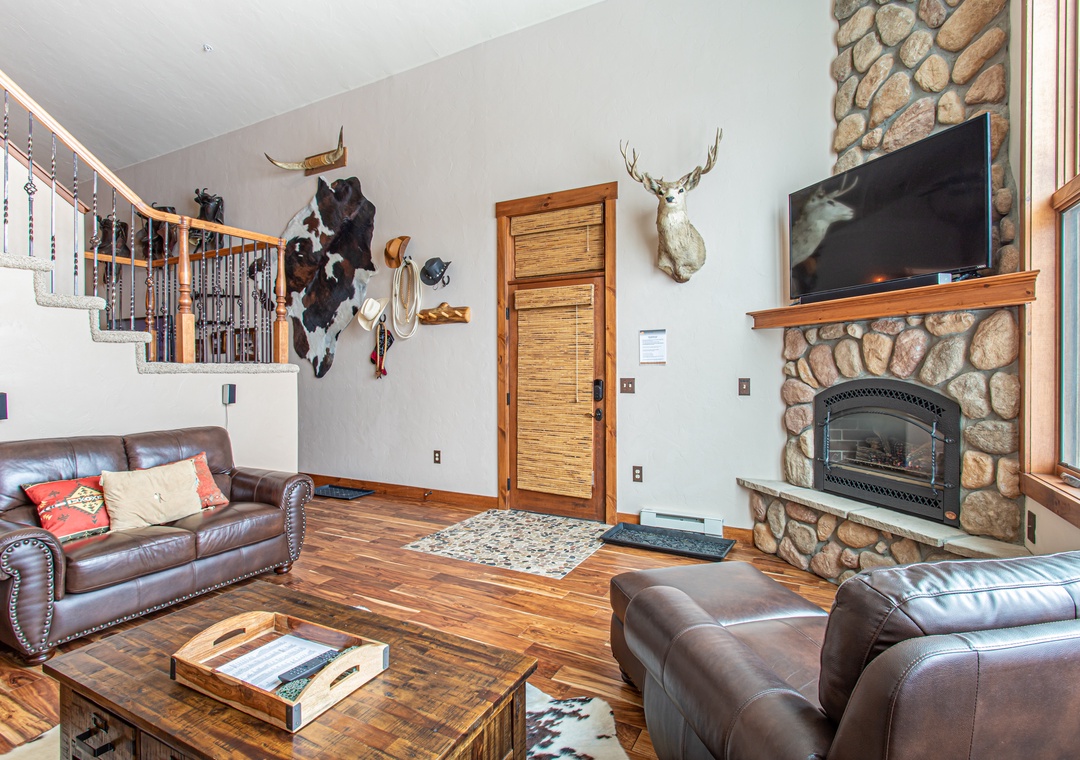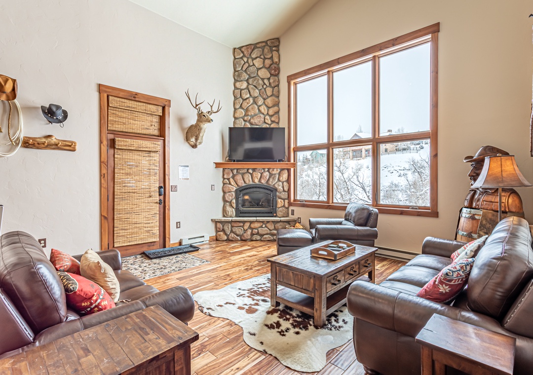 - Spacious Living – Open-concept great room with cathedral ceilings, seasonal gas fireplace (May - November), and leather seating