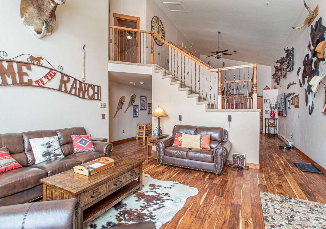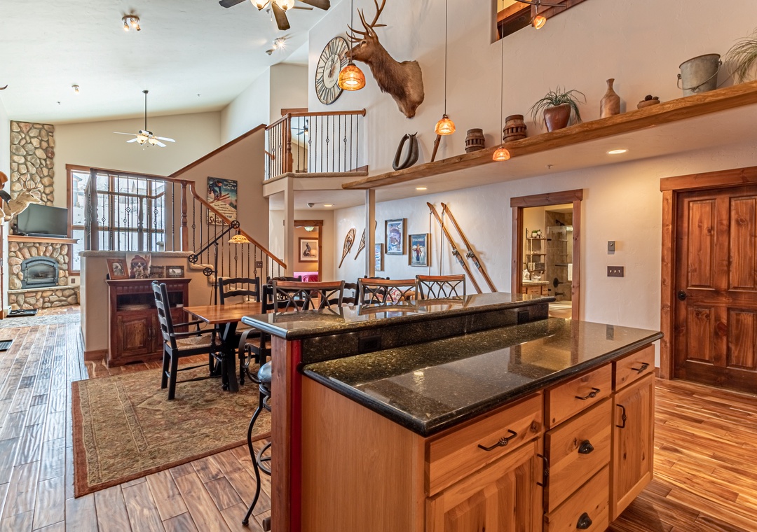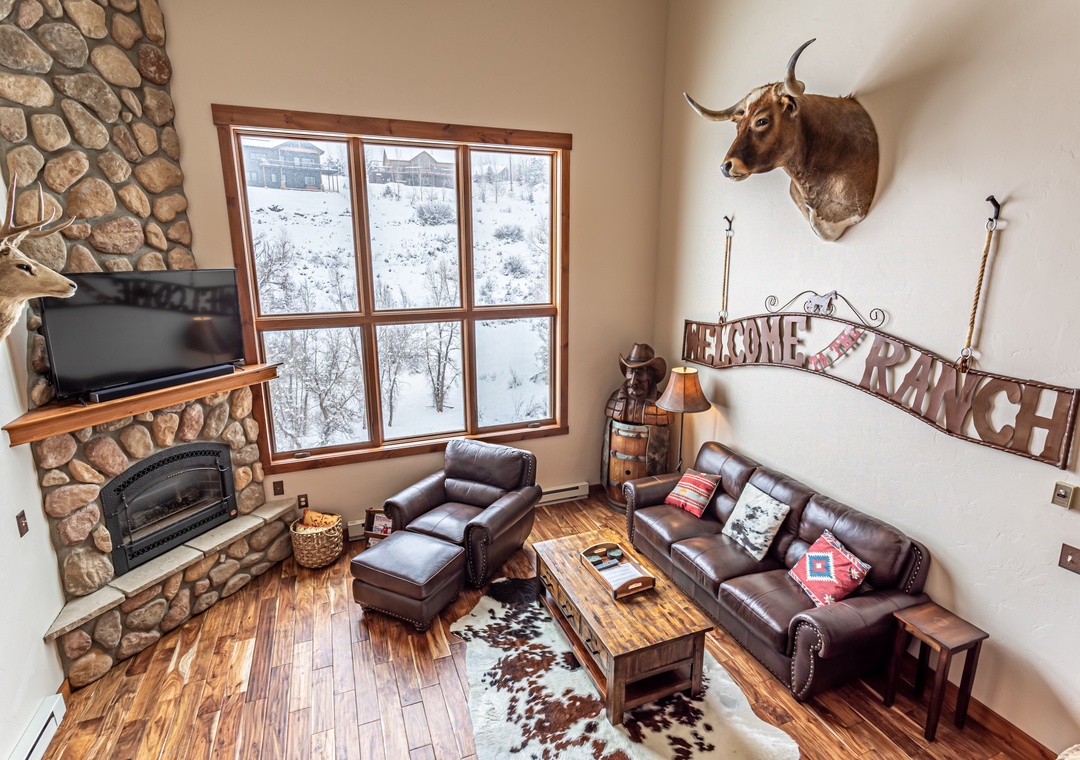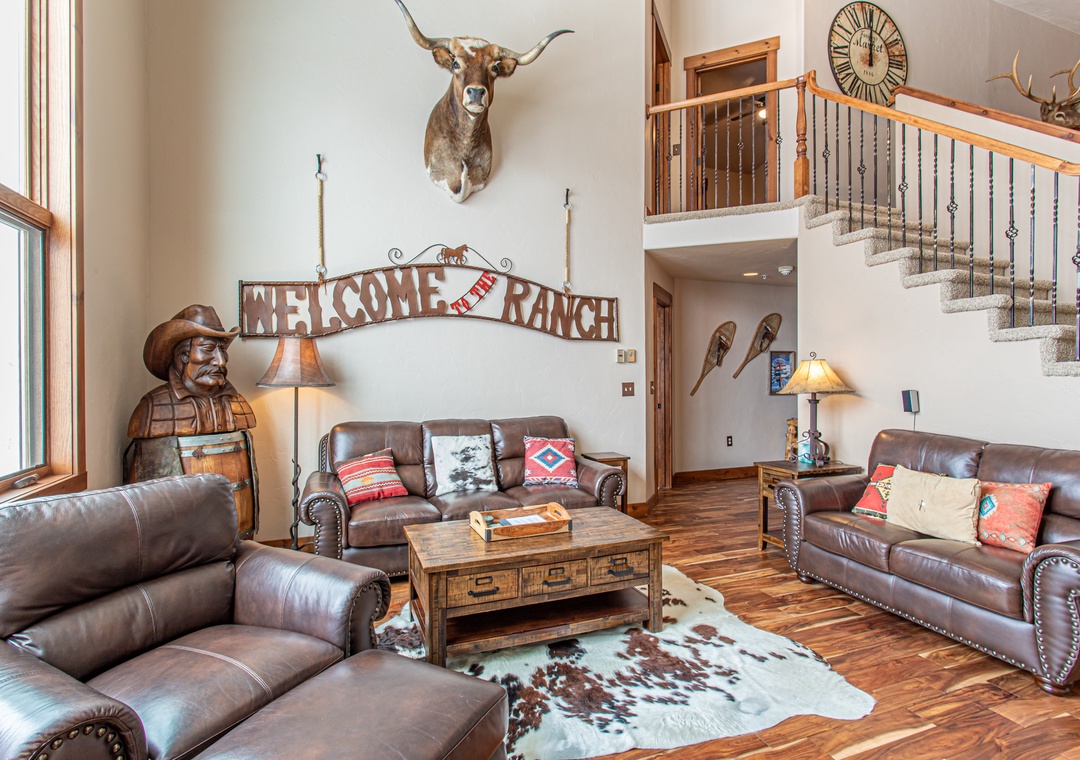 - Spacious Living – Open-concept great room with cathedral ceilings, seasonal gas fireplace (May - November), and leather seating