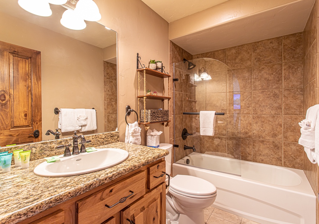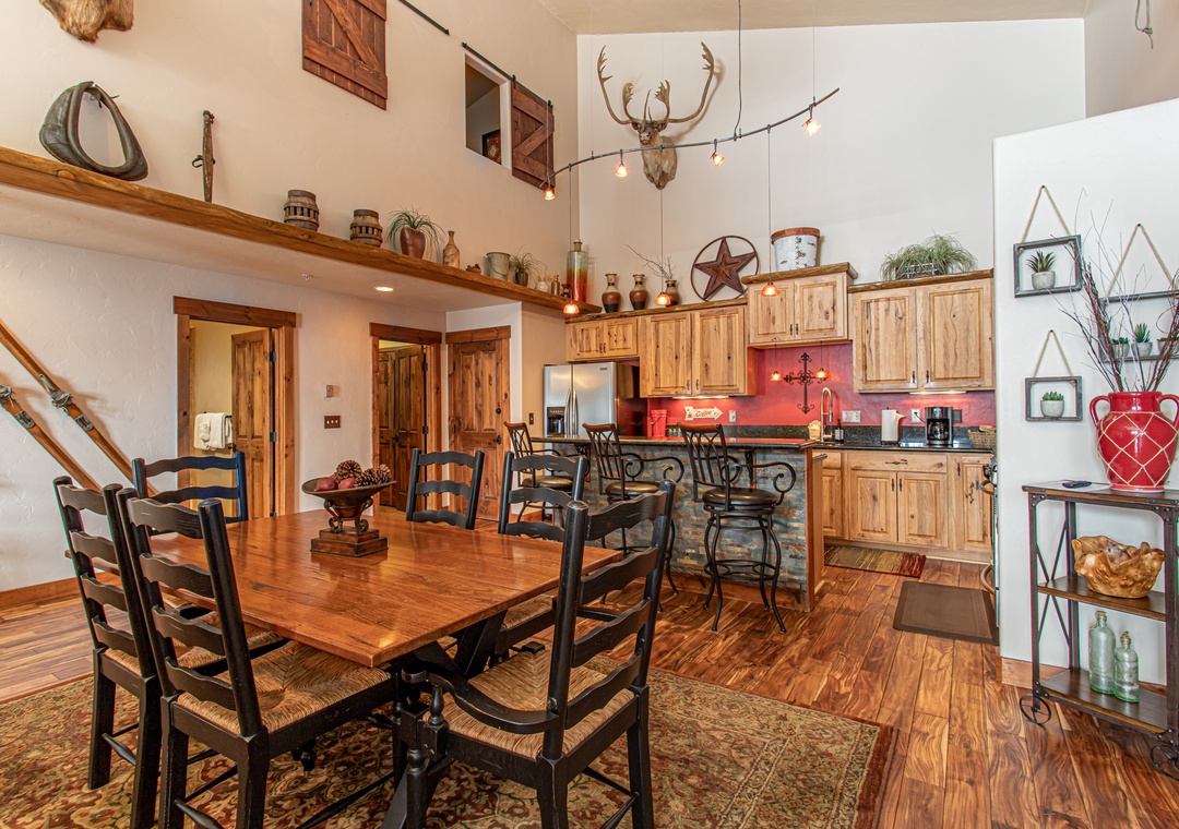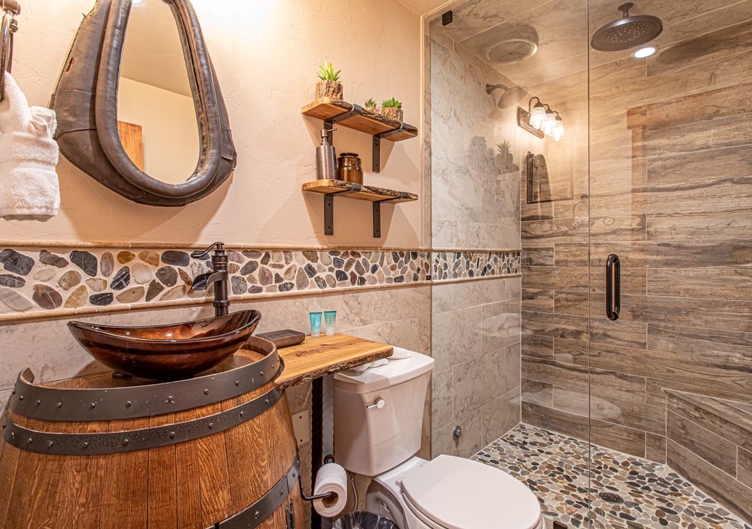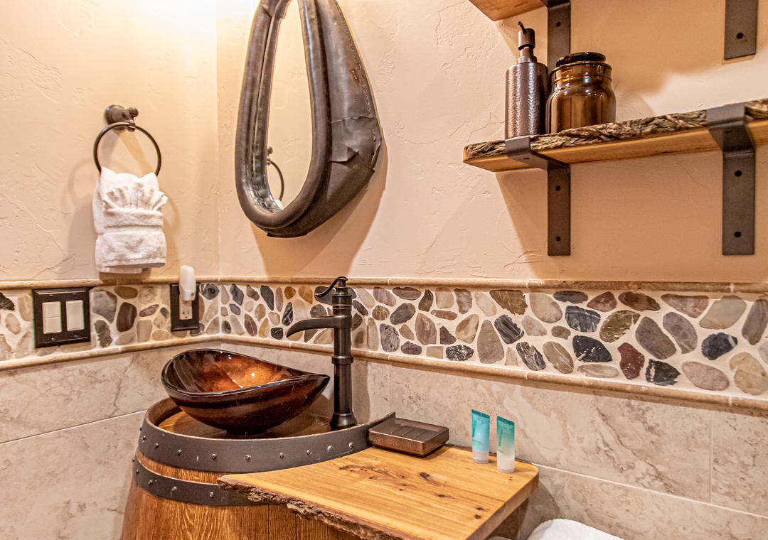 - Unique Touches – Wine barrel sink, horse yoke mirror, and mountain-modern finishes throughout