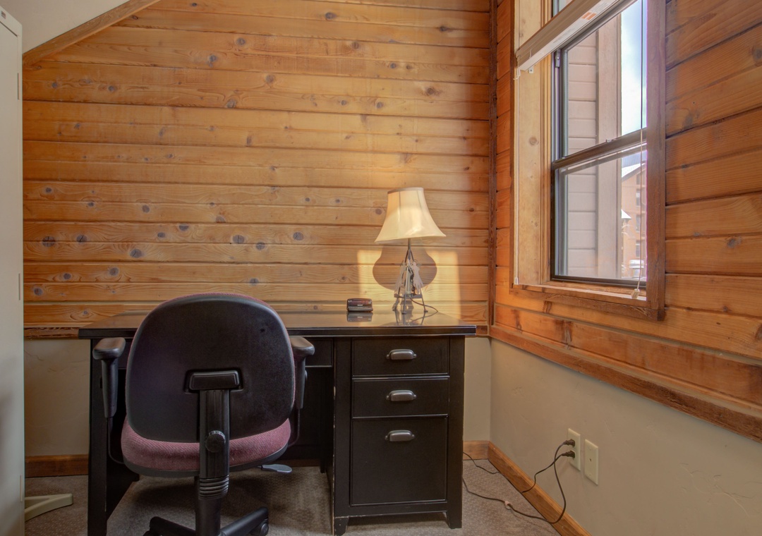Inside, the condo features soaring vaulted ceilings and an abundance of natural light from expansive windows and skylights. The living area is warm and inviting with a leather sofa and loveseat, a large flat-screen TV, and a raised-hearth gas fireplace. Step onto the private balcony to take in the crisp mountain air, or get some work done in the cozy office nook with serene mountain views.